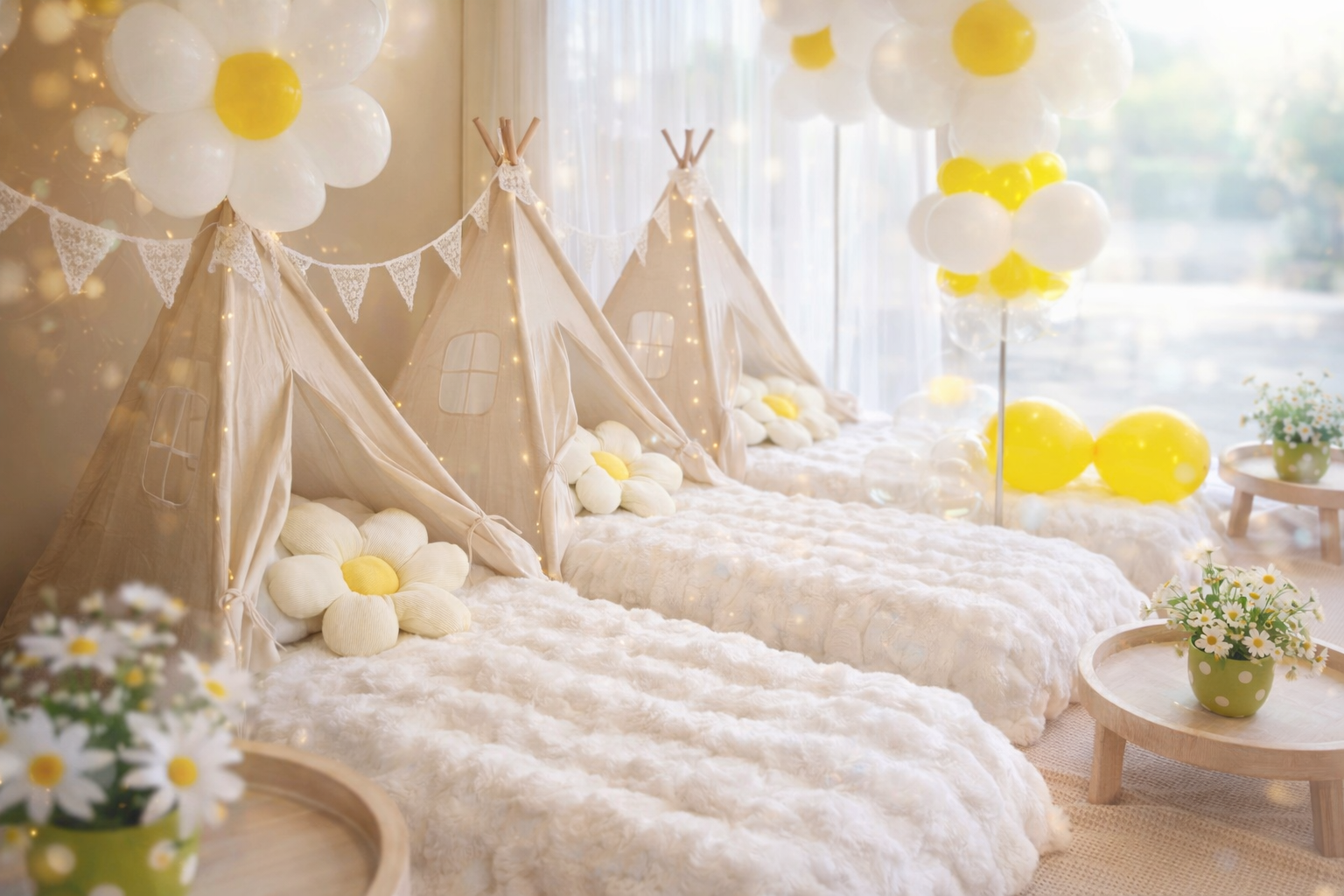 Luxury teepee slumber party hire perfect for birthday and sleepovers - including mattress, bedding, cushions and themed decor.